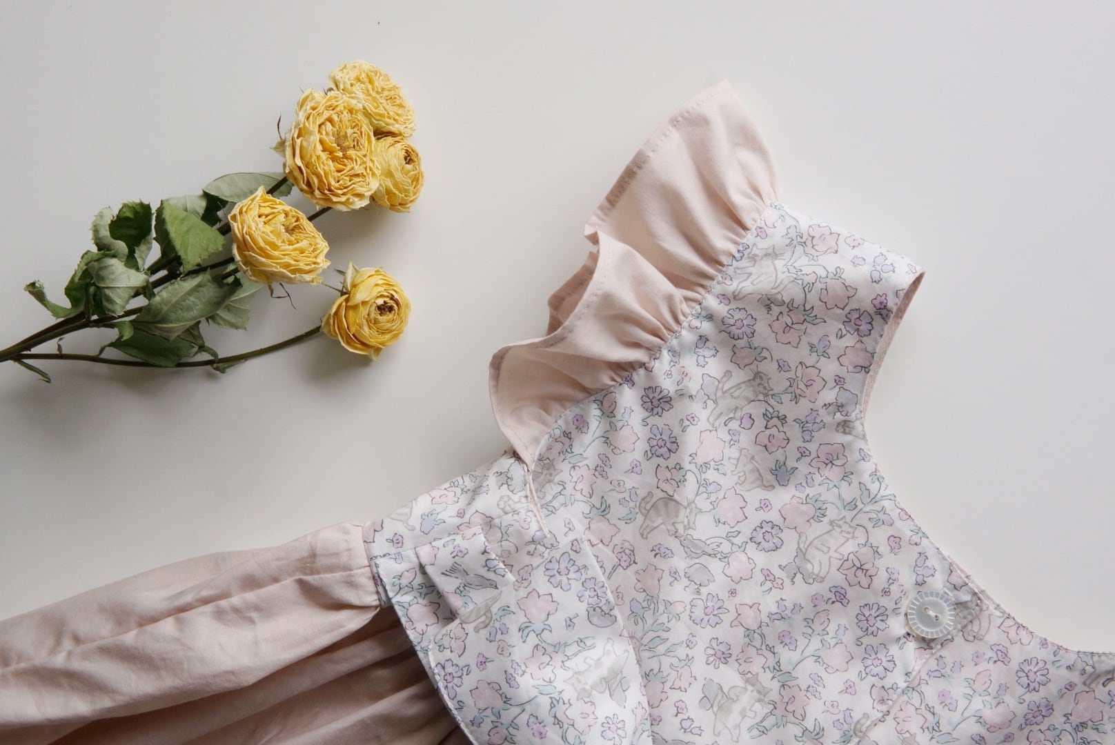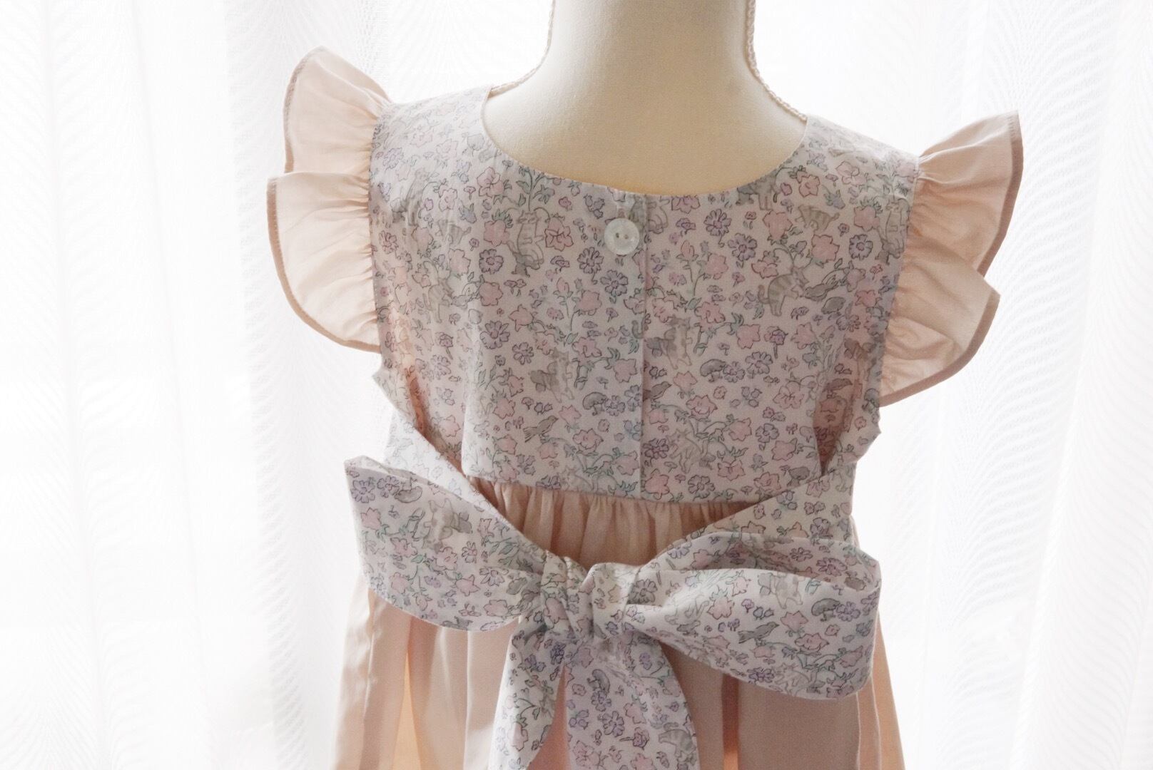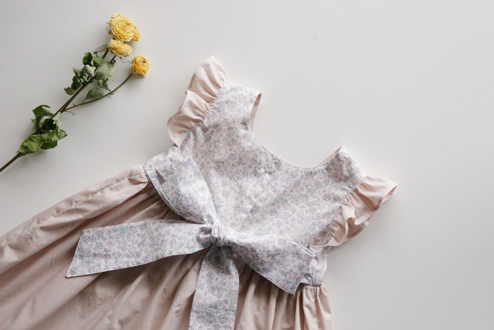 リバティToraneko Rivendellk(トラネコリベンデール)と海のブロード(グレイッシュピンク)でフリルワンピースを作成します。